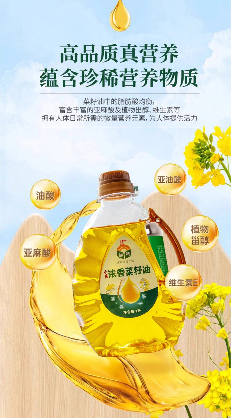 仙特壓榨菜籽油,源自四川綿陽(yáng)精選優(yōu)質(zhì)非轉(zhuǎn)基因油菜籽,秉承傳統(tǒng)小榨工藝,熱榨濃香,冷榨純香,充分保留了菜籽的營(yíng)養(yǎng)成分與濃郁香氣。不添加任何化學(xué)溶劑,確保油品健康天然。成品油色澤清亮,適合煎、炒、炸、蒸等多種烹飪方式。